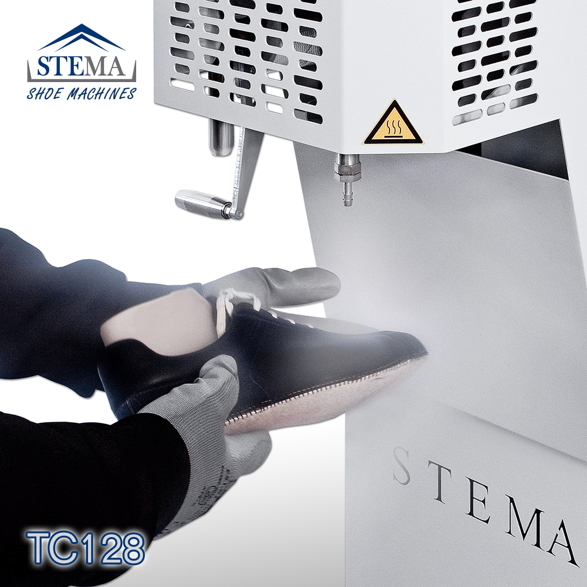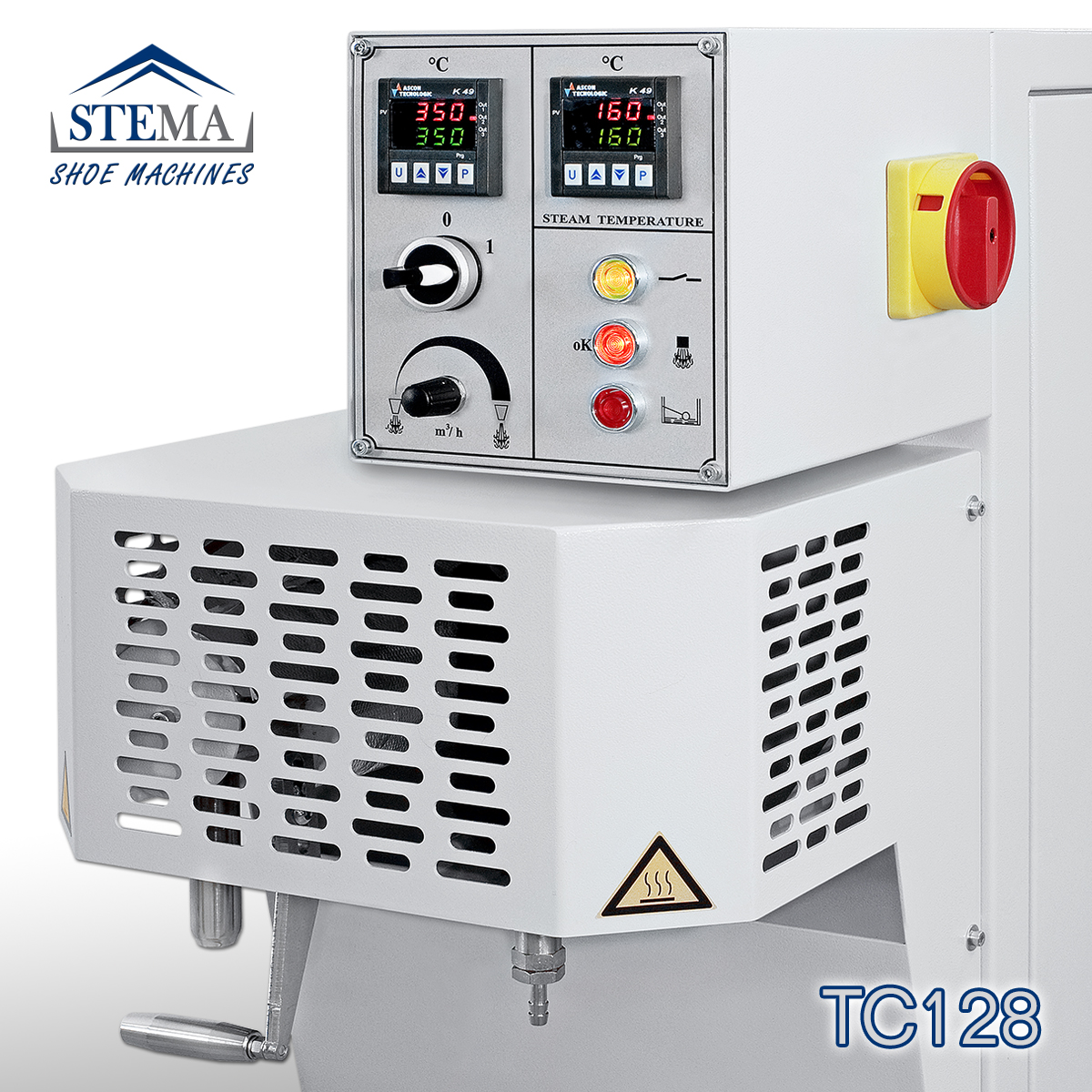 Termostiratrice industriale ad aria con la regolazione della temperatura del vapore. Macchina di nuova concezione, frutto dell’applicazione delle più avanzate tecnologie nel riscaldamento, movimentazione dell’ aria e produzione di vapore. Il nuovo sistema di utilizzo del vapore (PATENT) permette di determinare la temperatura e la pressione di lavoro sulla scarpa o stivale. Il vapore, la cui temperatura è regolabile da 115° a 170° assume caratteristiche diverse a seconda che esso sia “vapore”, “vapore saturo”, “vapore saturo secco”.